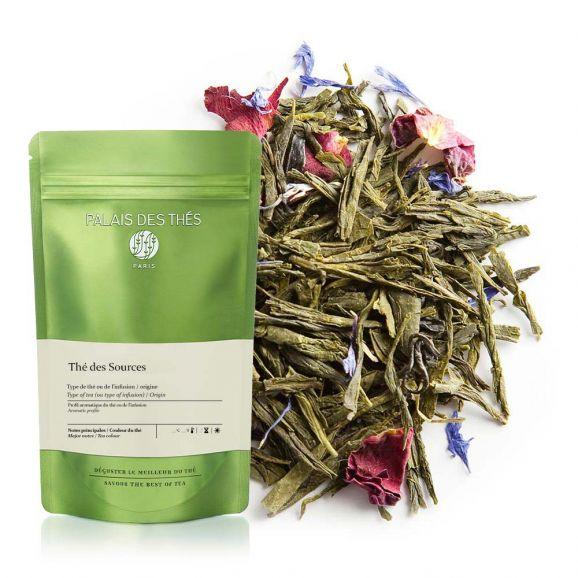 Frais et désaltérant, le Thé des Sources est un thé vert à la menthe rehaussé d'une pointe de bergamote. Il est parsemé de pétales de rose et de bleuet.