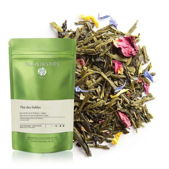 Inspiré d'un voyage au Maroc, le Thé des Sables est un mélange à base de thé vert créé par Palais des Thés. La rose de Damas, célèbre rose cultivée sur les versants de l'Atlas, est associée aux fruits du soleil - mangue, pêche jaune et agrumes- pour restituer la saveur unique d'une confiture de pétales.