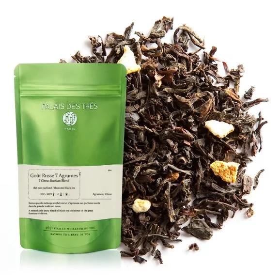 Goût Russe 7 agrumes est un superbe mélange de thés noirs et d'agrumes, évoquant le citron, le citron vert, l'orange douce, l'orange amère, le pamplemousse, la bergamote et la mandarine.