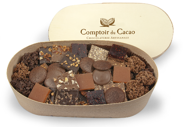 noires 72% aux oranges confites, Gianduja lait 36% au caramel beurre salé.